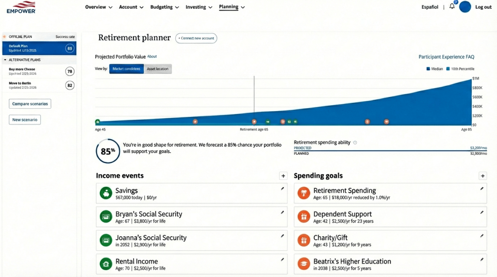 Tools like Empower, Boldin, and ProjectionLab let you model your probability of a comfortable retirement under each scenario. Then they run thousands of simulations of what the future might hold (i.e. Monte Carlo simulations) and give you a guess at your chance of “success” (usually defined as dying without running out of money).